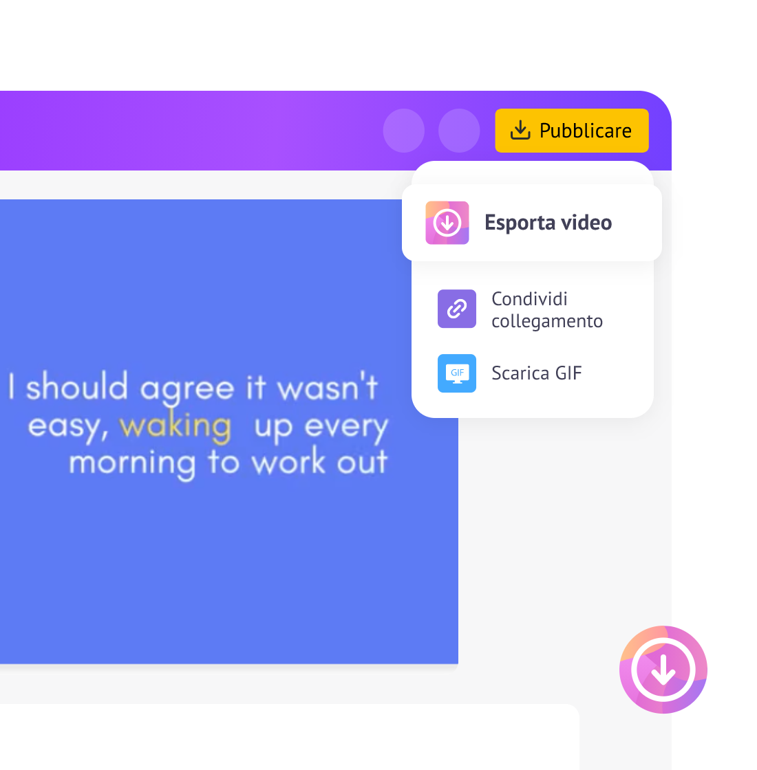 Una volta che sei soddisfatto del video creato, puoi scaricarlo in qualsiasi qualità da SD a Ultra HD o anche pubblicarlo direttamente sui social media.